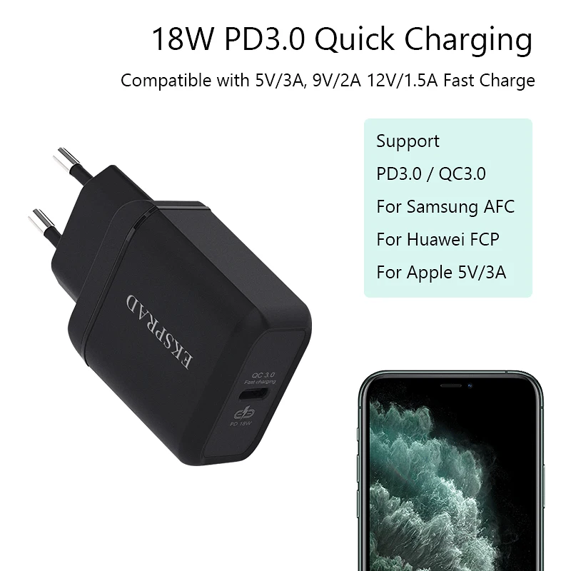 Best Seller EKSPRAD PD Charger 18W QC3.0 USB Type C Fast Charger for iPhone 11 11Pro X Xs 8 Xiaomi Samsung Phon
