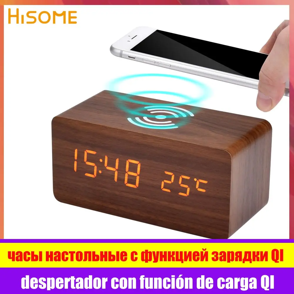 Best Product Desktop Digital Clock Led Alarm Clock with Phone Wireless Charger Sound Control Wooden Led Clock wi